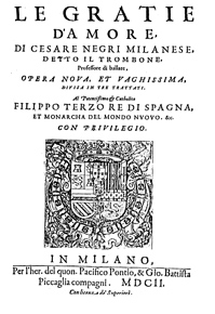 Questo è il frontespizio di una delle opere fondamentali della danza italiana del XVII secolo. Il trattato "Le Gratie d'Amore", edito a Milano nel 1602, non è soltanto una raccolta di danze, ovvero la dettagliata descrizione di passi e coreografie, con in più la notazione musicale (lo "spartito" si direbbe oggi) e la relativa intavolatura di liuto, lo strumento allora più diffuso anche nelle abitazioni private. | ||